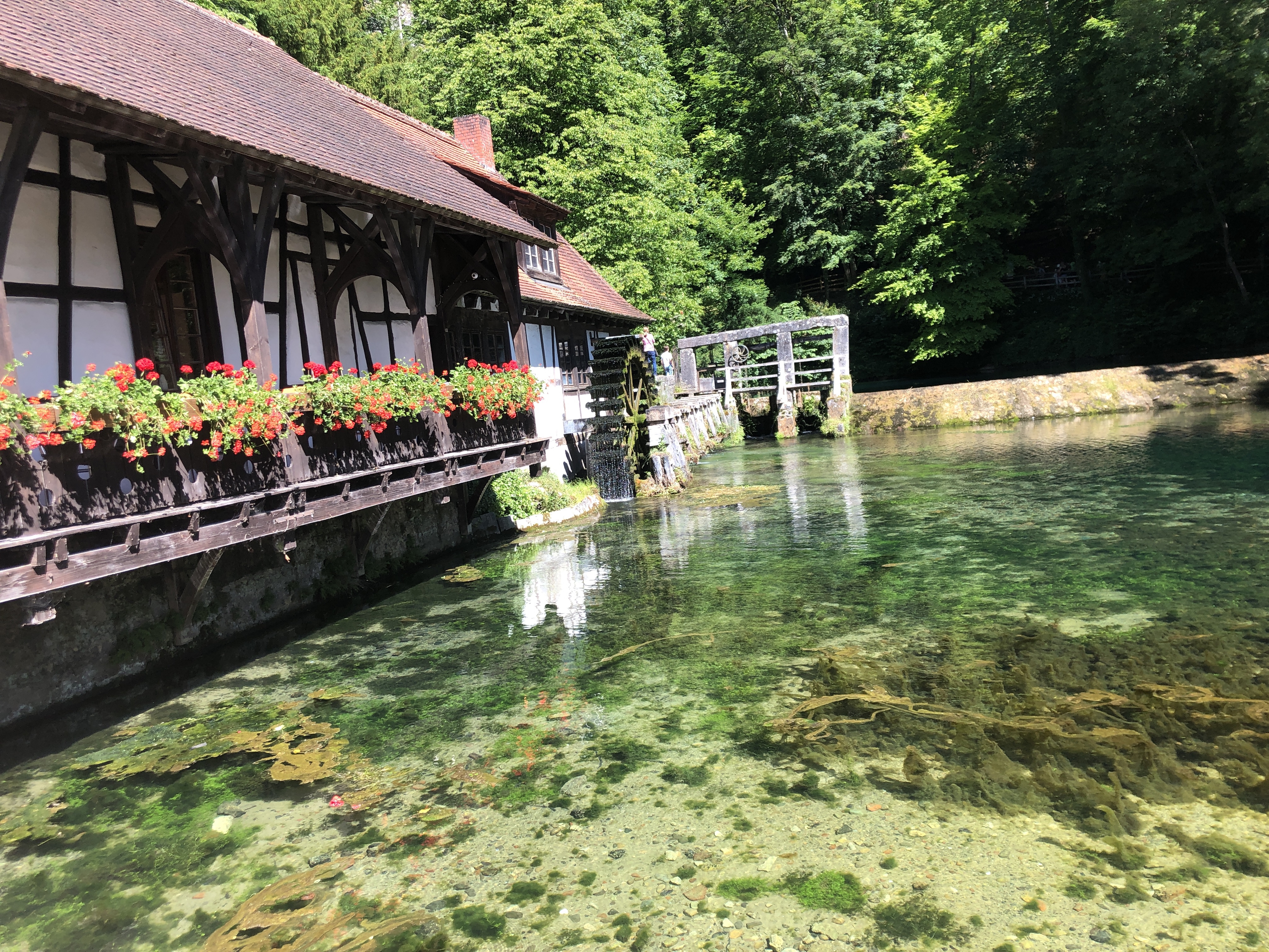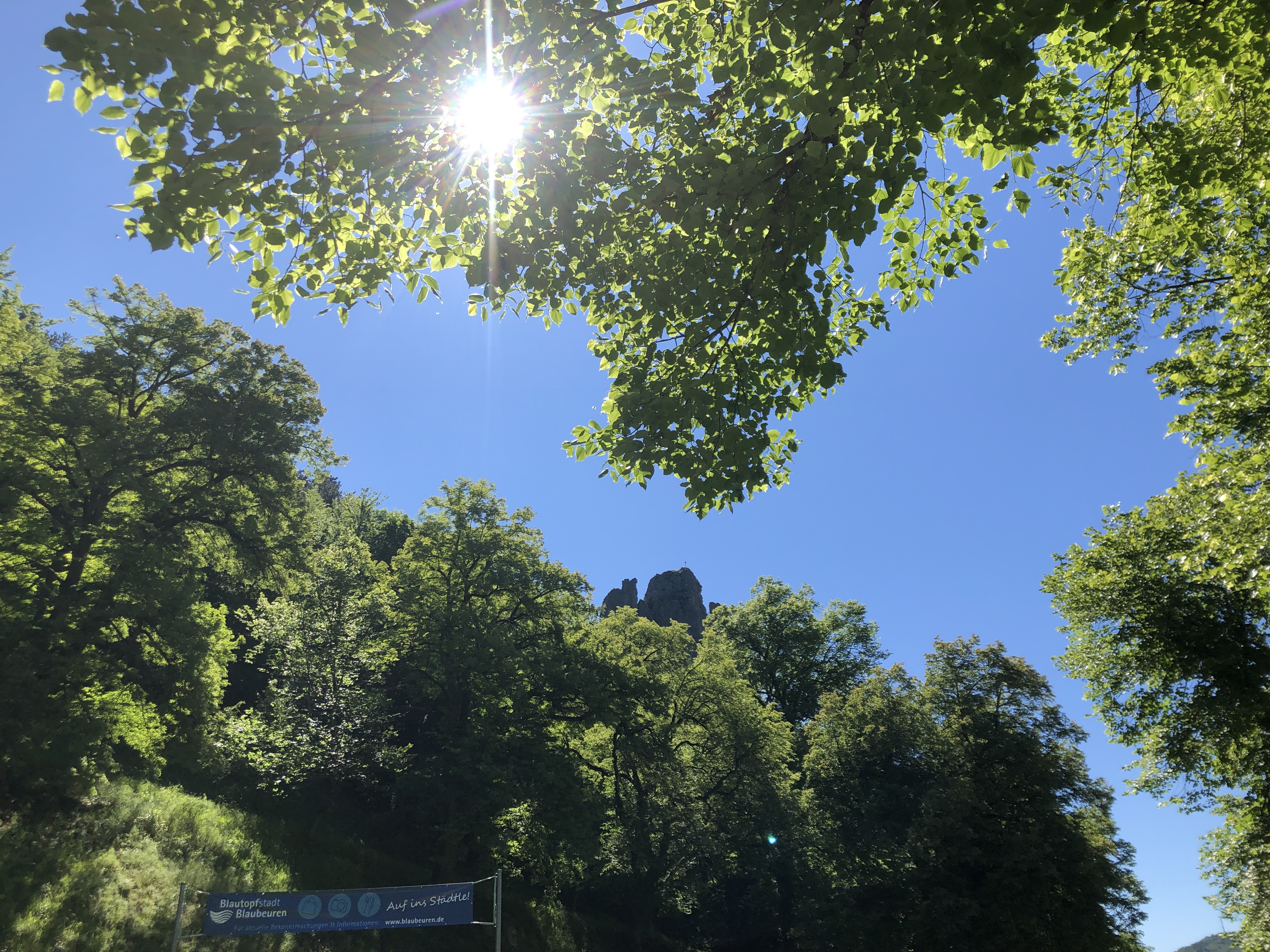 Ein traumhafter Morgen. Enkel haben bei uns im Wohnwagen übernachtet. Kein Problem bei Oma und Opa. Nach dem Duschen zwei Tassen Kaffee und wir sind startbereit. Heute wollen wir vom Campingplatz Heidehof nach Blaubeuren laufen. Start 08.20 Uhr. Über Felder und Wiesen alleine am sonnigen Morgen mit stahlblauen Himmel. Es könnte nicht schöner sein. Wir wandern gemütlich vor uns hin und laufen ohne große Umwege in Blaubeuren ein. Ab zum Blautopf. Ich gönne mir ein Eis mit Eierlikör, die Bierliesl einen Russ mit Kartoffelsalat. Super.