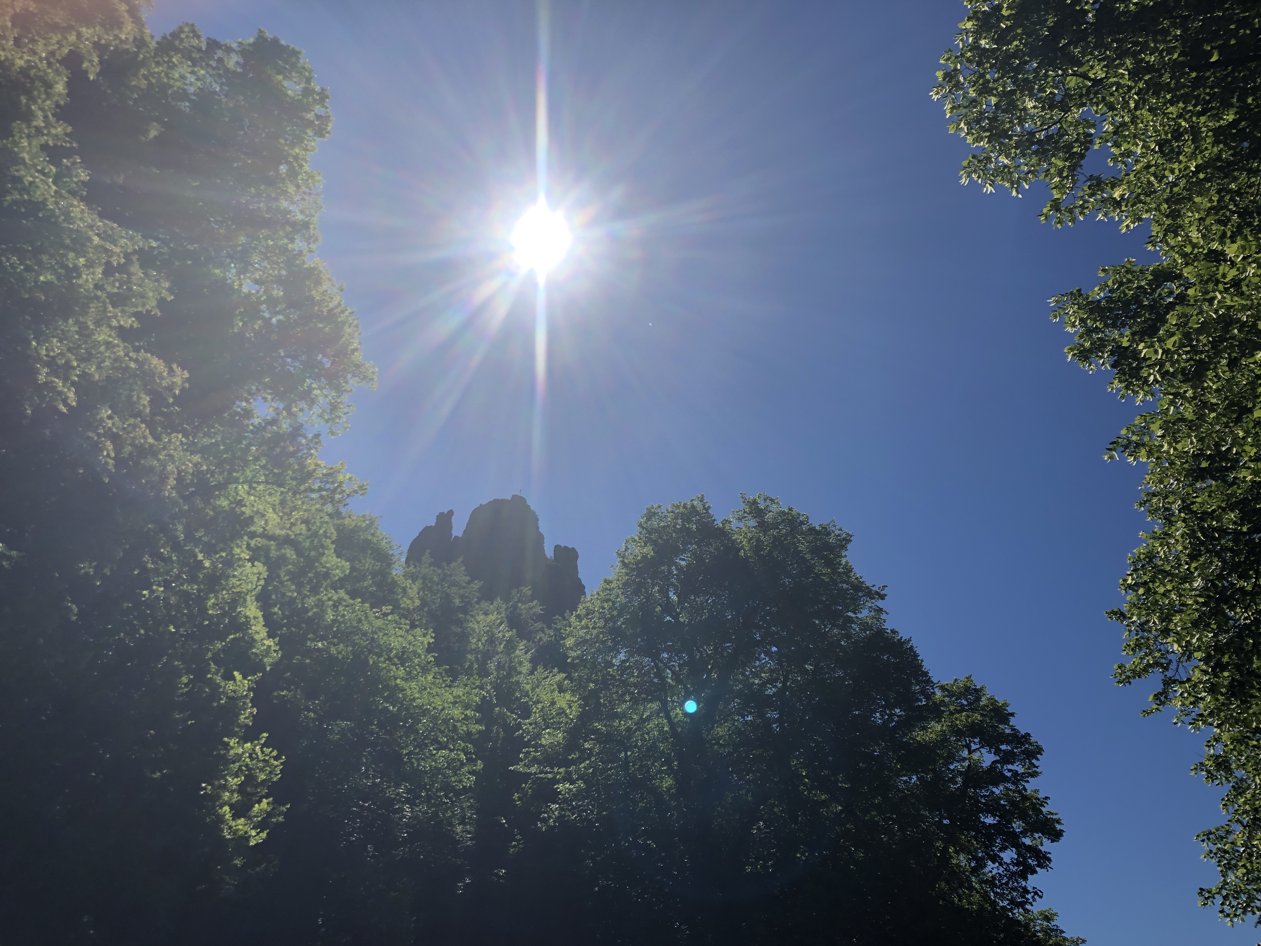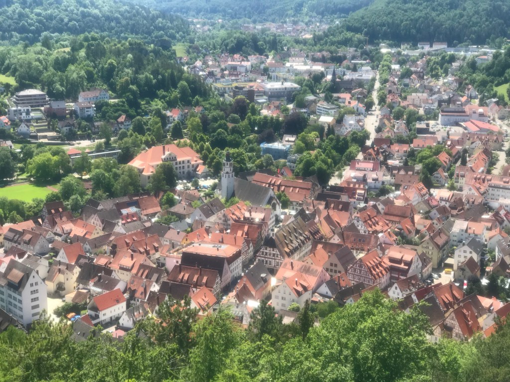Der Rückweg geht in Blaubeuren gleich recht steil die Treppen hoch und über die Strasse in den Wald stetig aufwärts. Viel los hier. Oben angekommen war es uns klar, ein Aussichtspunkt auf Blaubeuren mir Kletterfelsen.