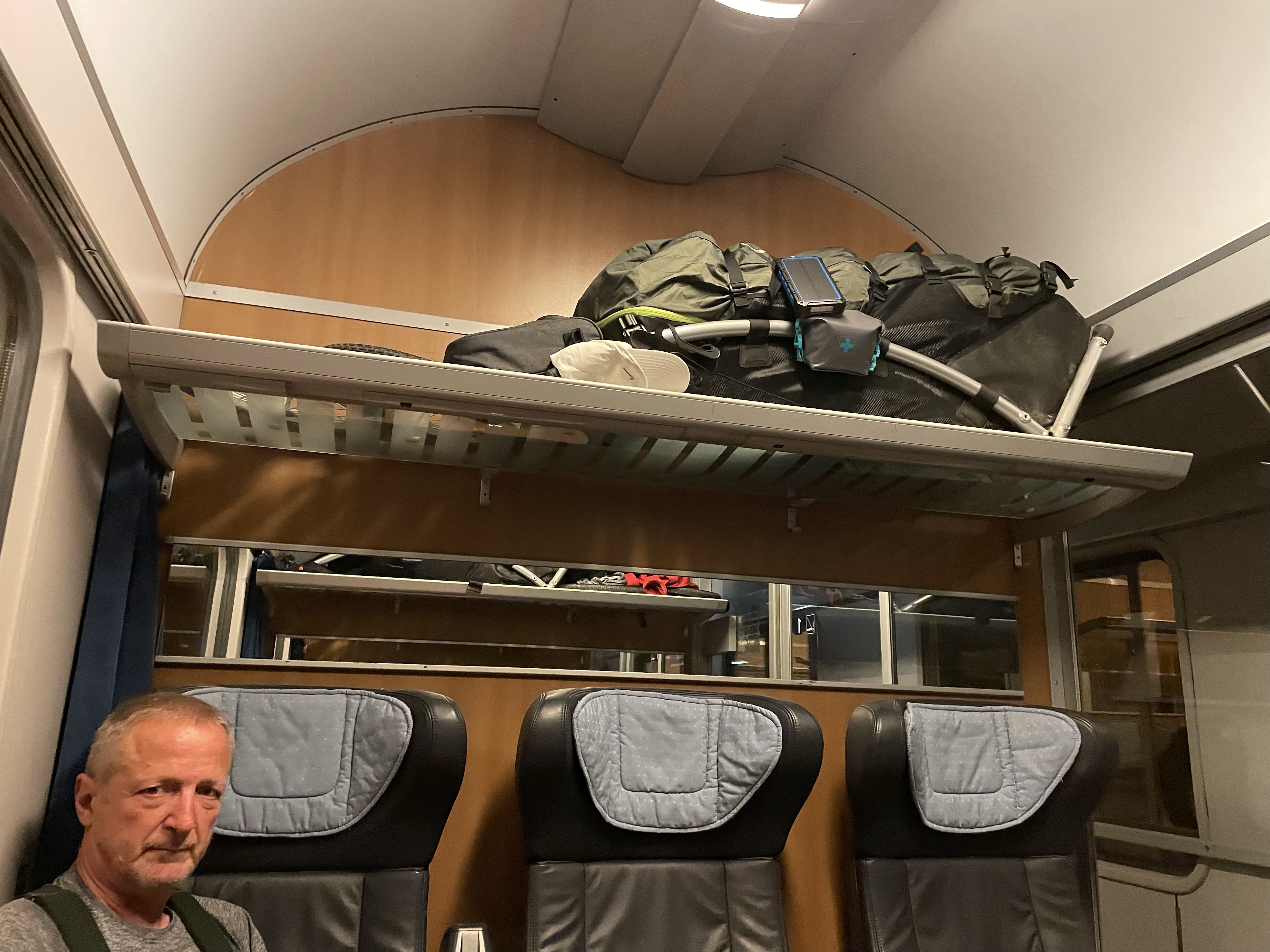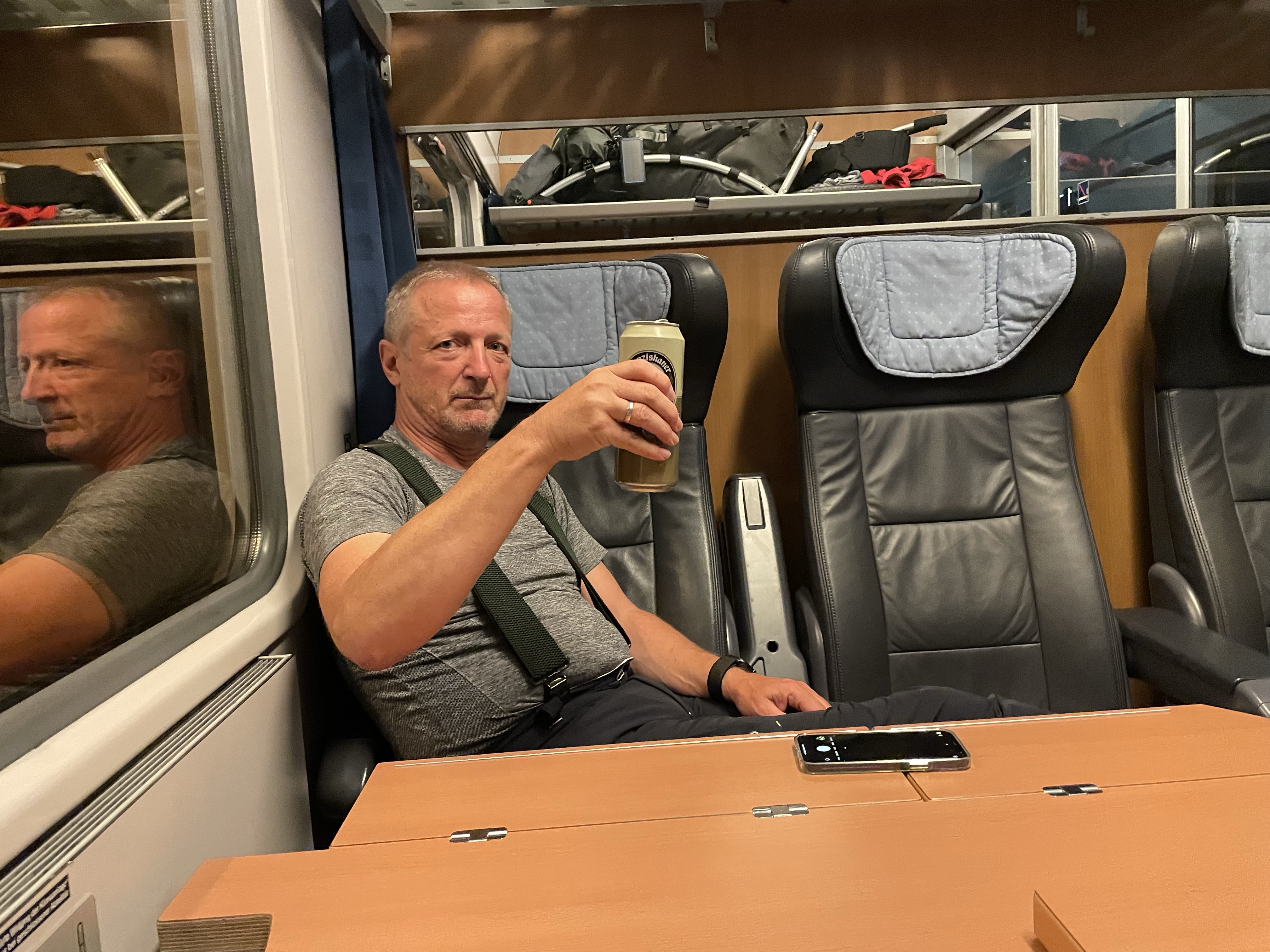 So jetzt geht es los. 19.30 Uhr holt uns unser Schwiegersohn Thomas von Senden ab und fährt uns nach Ulm. Zeitlich passt alles. Elisabeth kauft noch schnell Getränke (2 Bier dürfen nicht fehlen) und jetzt warten auf den Zug. Abfahrt 20.49 Uhr. Die ersten Neugierigen haben schon nach unserem Wheelie gefragt. Sind auf die Zugfahrt gespannt.