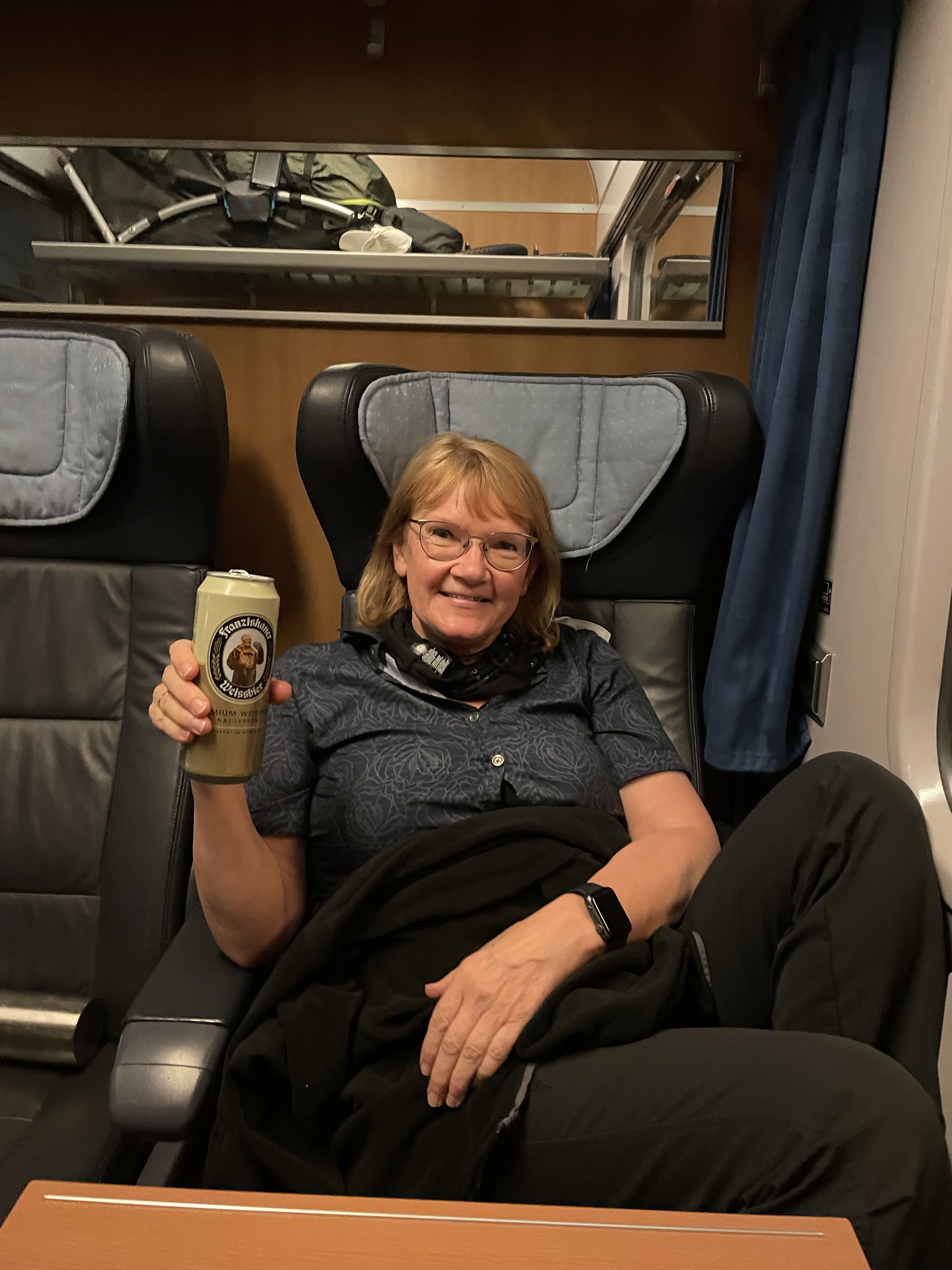 Sitzen jetzt im Zug . Nur eine Person ausser uns im Wagon. Ein netter Schaffner hat uns noch den den Wartebereich für unseren Zug genannt. Ankunft Frankfurt 23.09 Uhr. Ab Stuttgart nur noch Elisabeth und ich im Großraumabteil. Super.