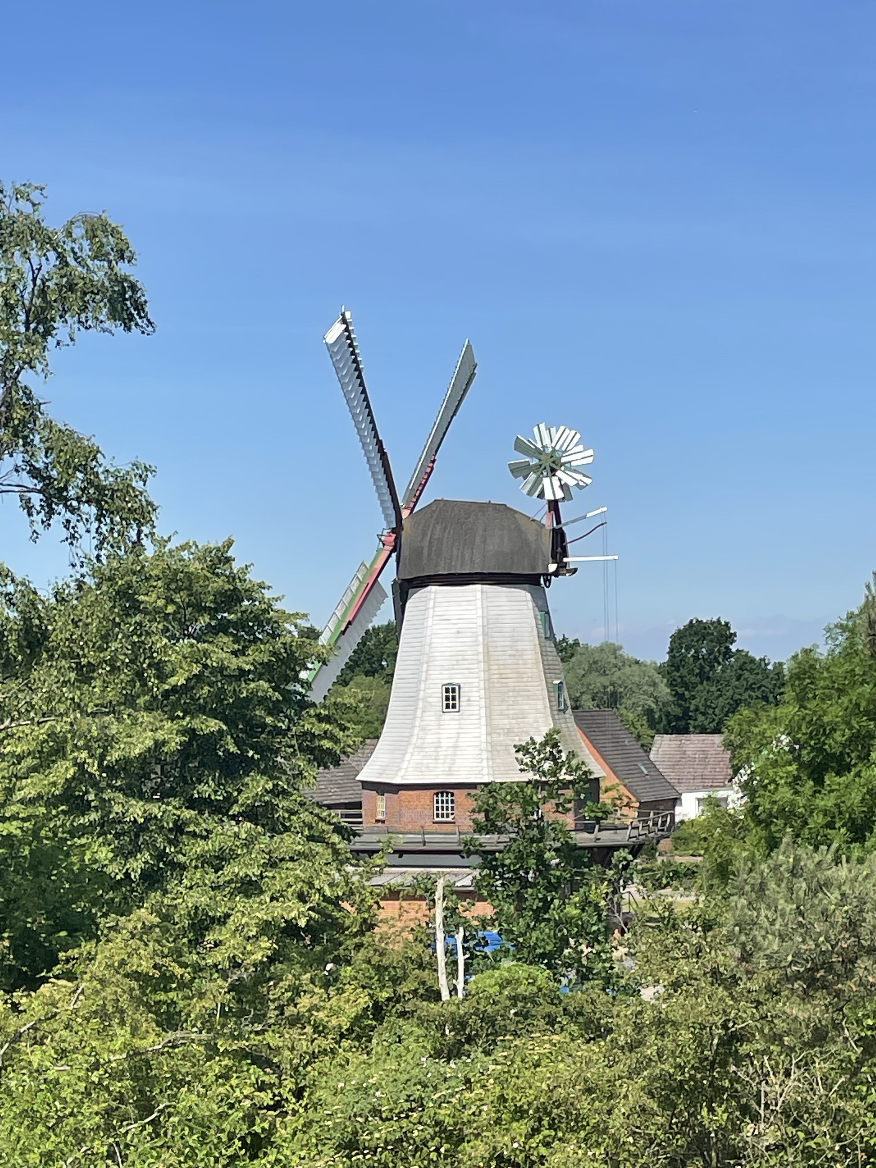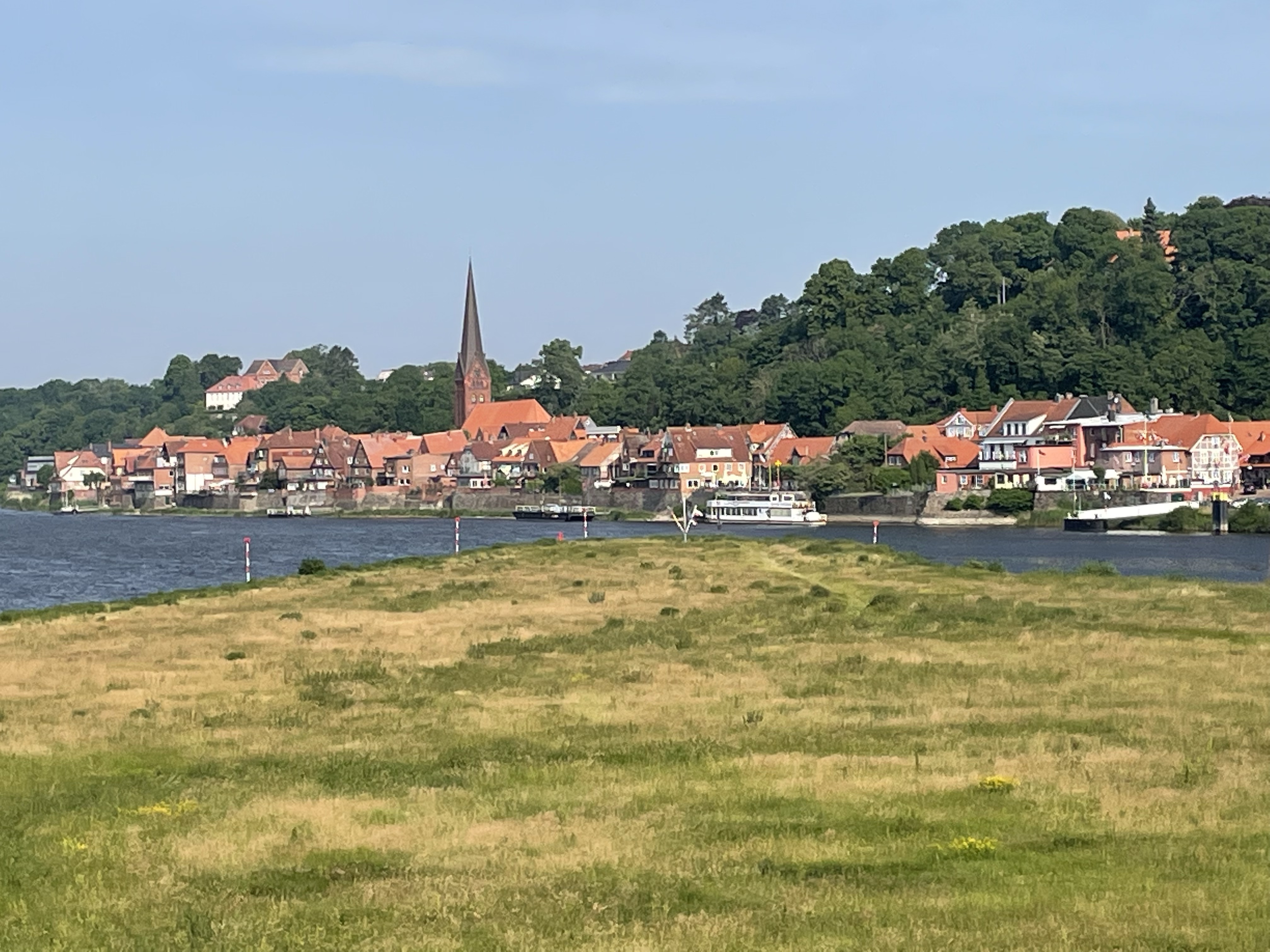 Wir verlassen den sehr schönen Campingplatz mit den super freundlichen Betreibern. Über 500 m müssen wir bis zum Ausgang laufen um dort die selbe Strecke wieder hinter dem Zaun zurück zu laufen! Nachdem es heute wieder sehr heiß ist, freuen wir uns, dass der Weg durch den Wald geht. Später kommen wir dann auf den Radweg wo wir auch gleich eine Apotheke und ein Geschäft finden. Wir trinken dort einen Cappuccino und laufen weiter entlang des Radweges wo „Gott sei Dank „ immer eine kleine Brise geht. Bis jetzt ging es dem Bein von Elisabeth noch sehr gut, allerdings macht sich ein leichtes Ziepen wieder bemerkbar, aber alles im Rahmen.