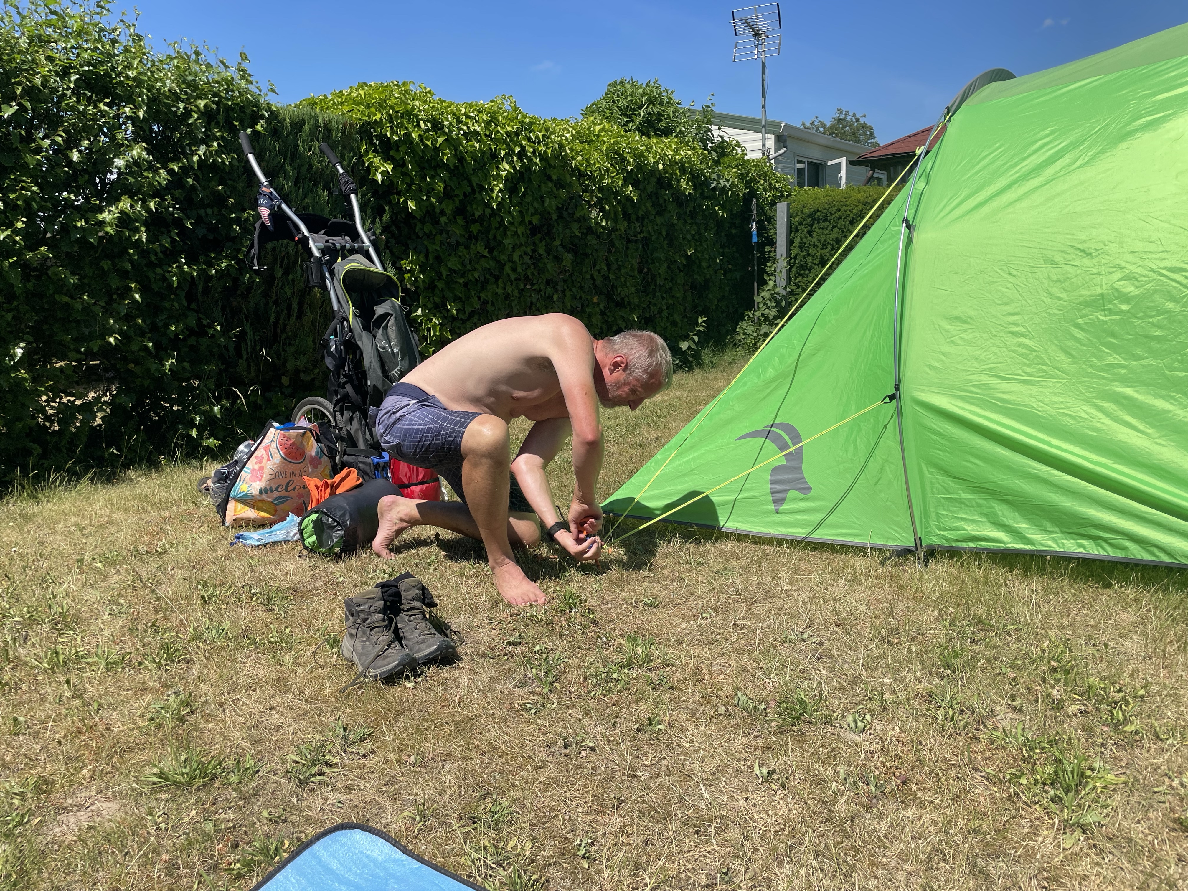 Wir bekommen gleich in der Nähe eine Zeltplatzparzelle. In der glühend heißen Hitze baut Thomas wieder das Zelt auf, während Elisabeth wieder die Stühle und den Tisch aufbaut. Aber kaum zur Ruhe gekommen hören auch die Schmerzen wieder schlagartig auf.