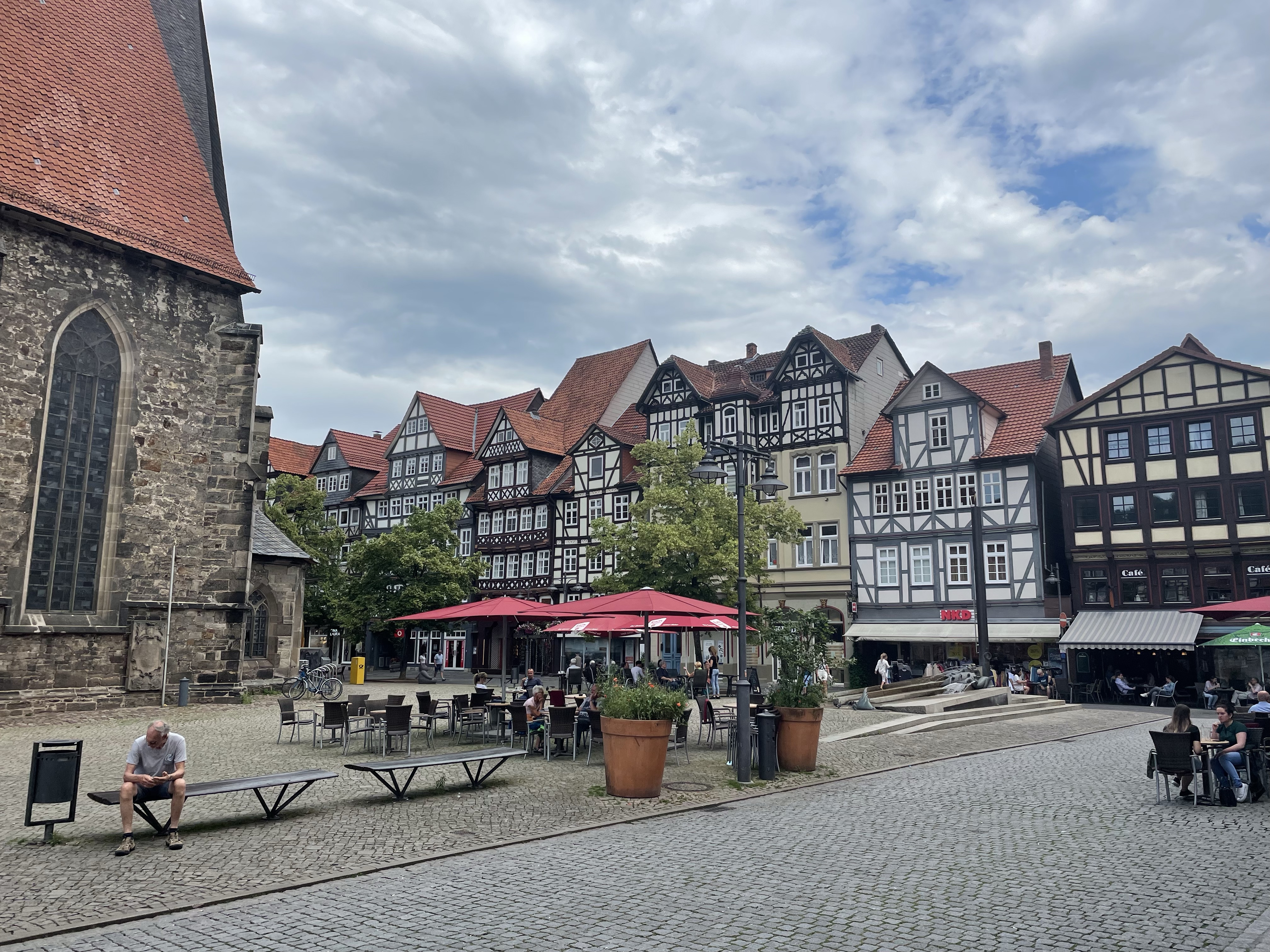 Wir bauen alles auf und gehen in die Stadt, die zwar sehr schön ist, da es sehr viele Fachwerkhäuser gibt, aber halt auch sehr touristisch. So gehen wir bald wieder zurück.