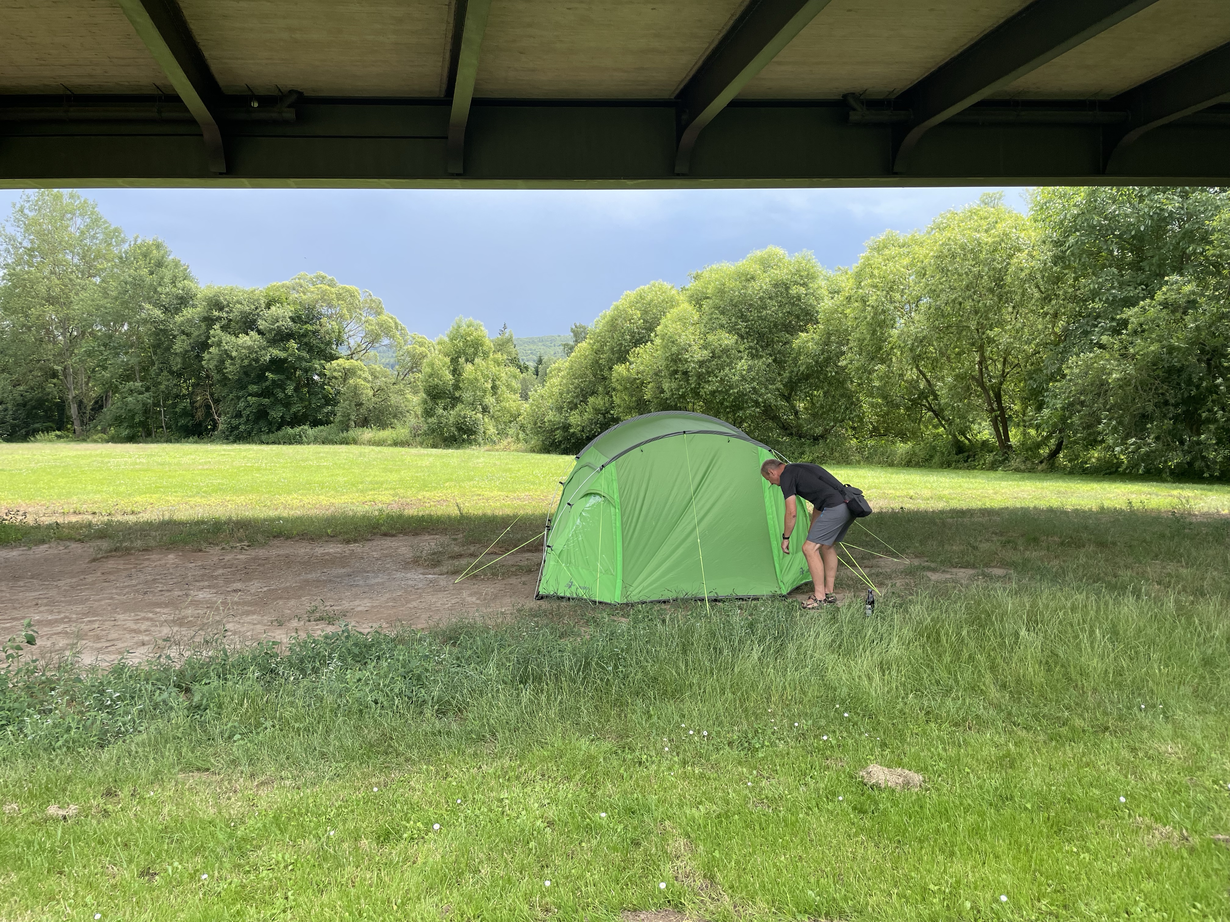 Wir werden sehr freundlich von einem Mann am Empfang bei unsere Anmeldung aufgenommen. Und so gibt er uns noch den Tipp unser Zelt unter der Brücke aufzubauen, da ein Gewitter um uns kreist und für heute Nacht Regen vorausgesagt wird.