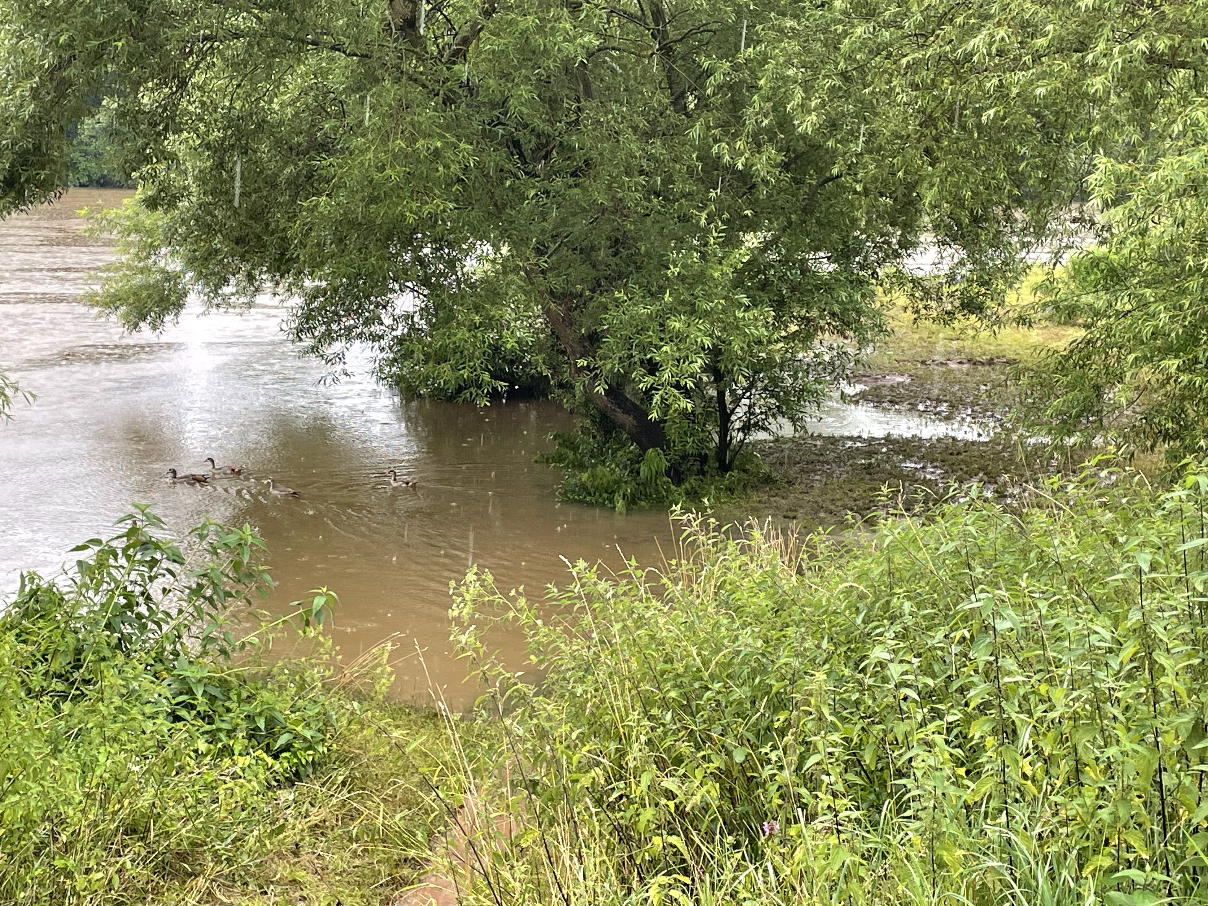 Der Main ist ganz schön gestiegen durch den vielen Regen. Auch jetzt kurz nach 12.00 Uhr regnet es wieder unaufhörlich. Es ist trotzdem ein schöner Weg dem Main entlang.