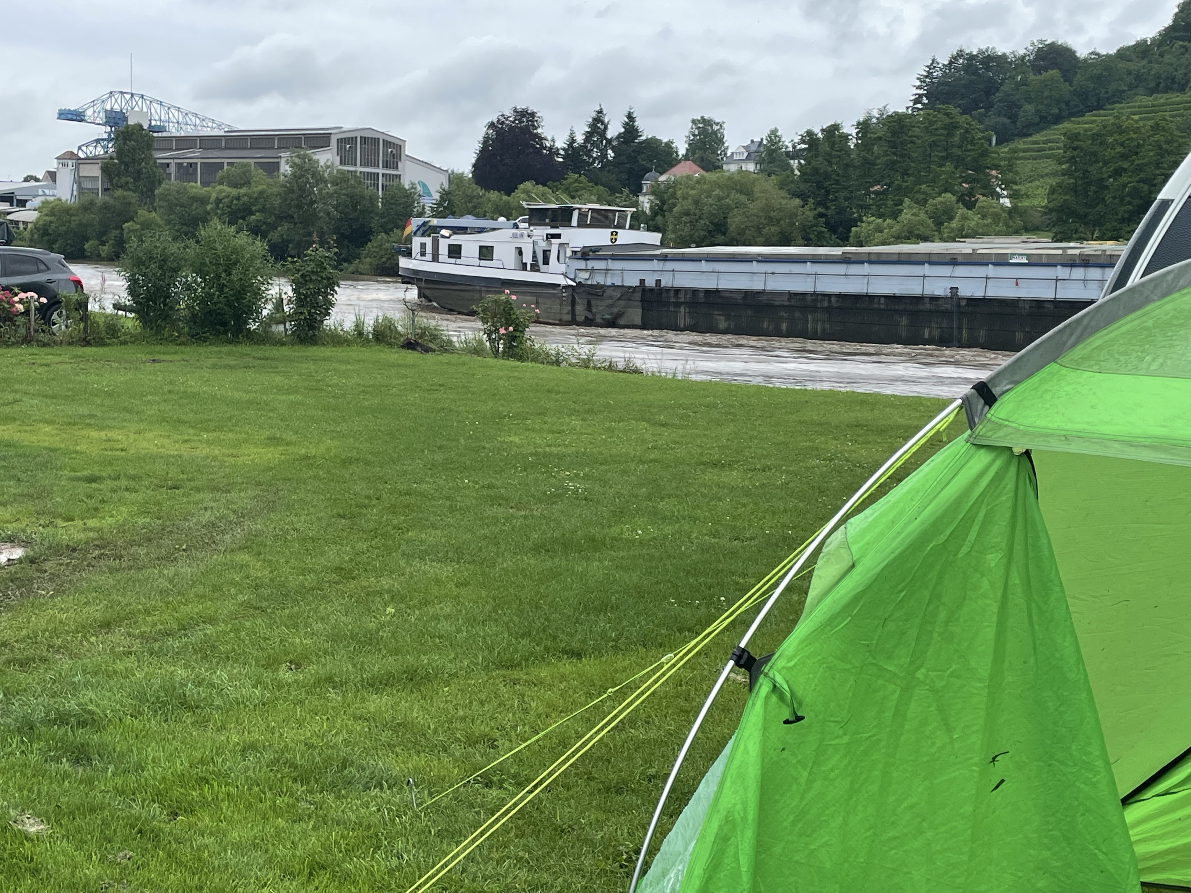 In Wörth am Main gibt es viel zu sehen: Viele Schwäne, Gänse und Enten kreuzen unseren Weg. Die Stadt hat am Main entlang eine hohe Mauern mit vielen Türen, die bei einer Flut stand halten sollen. Wir kommen auch an einer Werft vorbei wo emsig gearbeitet wird. Nicht weit davon entfernt ist schon unser Campingplatz direkt gegenüber eines Weinberges.