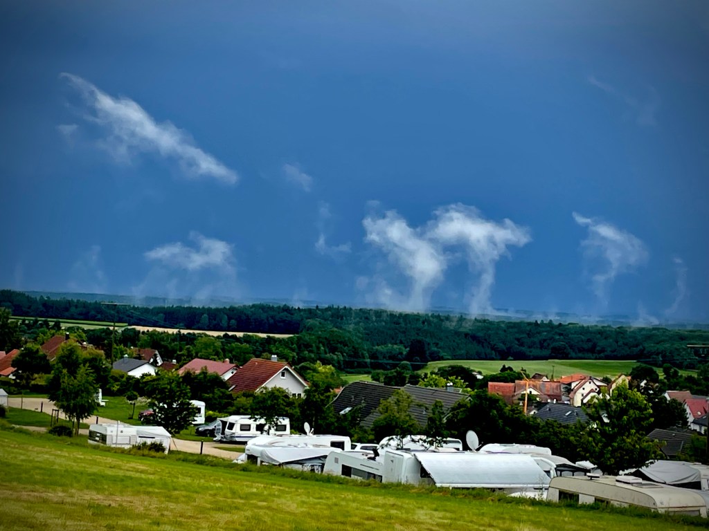 Leider wieder ein Weg an der Straße bei Regen und etlichen Höhenmetern. Trotzdem sind wir gut gelaunt und singen sogar. Nach der Ankunft und dem Aufbau vom Zelt, vergessen wir nach einer warmen Dusche alle Strapazen. Wir genießen noch unsere Mahlzeit und sehen anderen Campern beim Aufbau zu. Die Welt ist in Ordnung. 😉