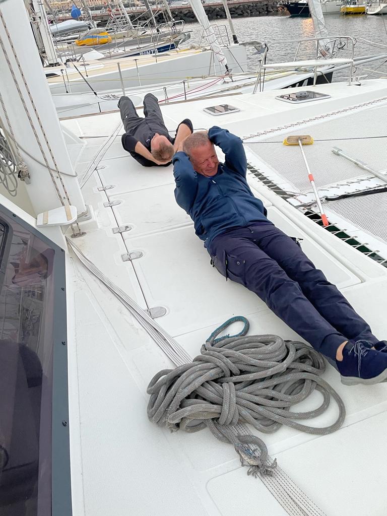 Während die Zwei einkaufen arbeiten Manfred, Frank und ich am Boot weiter. Zuerst checken wir die Dieseltanks. Diesel von den Kanistern einfüllen und zur Tanke mit dem Beiboot. Bei der ersten Fahrt mit Manfred bekomme ich eine Einweisung. Die weitere Fahrt erledige ich bereits alleine. Kaum zurück kommt ein Skipper von einem anderen Boot und bittet ihm zu helfen Diesel zu kaufen, da er kein Beiboot hat. Als erfahrener Dingifahrer fahre ich also mit einem Crewmitglied nochmals zur Tanke. Er ist sehr freundlich und kommt aus Griechenland. Wieder zurück wird das Dingi unter dem Katamaran durch zur Verstauung auf dem Hauptboot vorbereitet. Zuerst Aussenborder abmontieren und Restbenzin ablassen. Ich gehe noch schnell eine Spezialschraube kaufen damit der Aussenborder mit der Winsche hochgeholt werden kann. Nachdem der Aussenborder verstaut ist kommen auch schon Elisabeth und Hubert zum Einladen des Proviantes. Frank und Manfred arbeiten noch an der Bordelektronik.