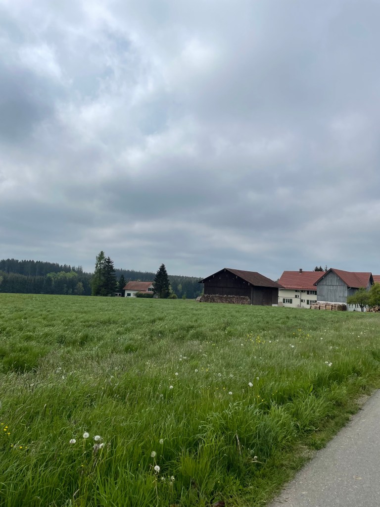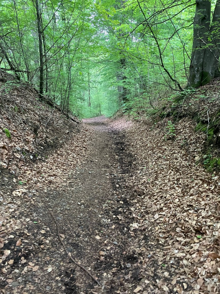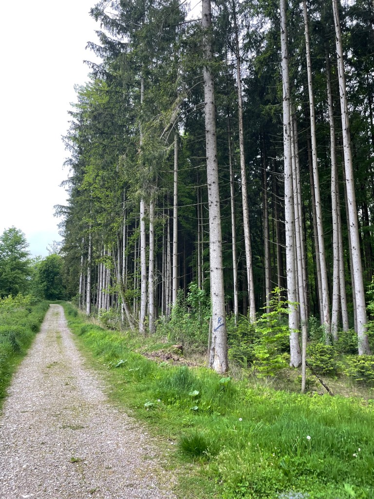 Der steile Weg wird nach ca 1,5 km immer flacher und wir kommen auf einen leichtläufigen Radweg und freuen uns darüber. Die Freude bleibt allerdings nicht lange. Wir müssen auf einen sehr unwegsamen Ackerweg, der sehr mühselig ist weiter. Und dann…! Ein steiler Weg auf den schwarzen Berg, wir können zwischendurch nicht anhalten, sonst ziehen uns unsere Weehlies den Berg wieder runter. Typisch Komoot!.