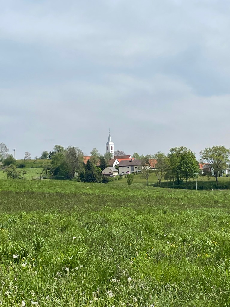 Endlich geschafft, setzen wir zu unseren letzten 5km an. In einem Dorf setzen wir uns auf eine Bank und essen nochmals von unserer Schokolade. Ein junges Paar mit zwei Kindern kommt vorbei und es entwickelt sich ein sehr angenehmes Gespräch.