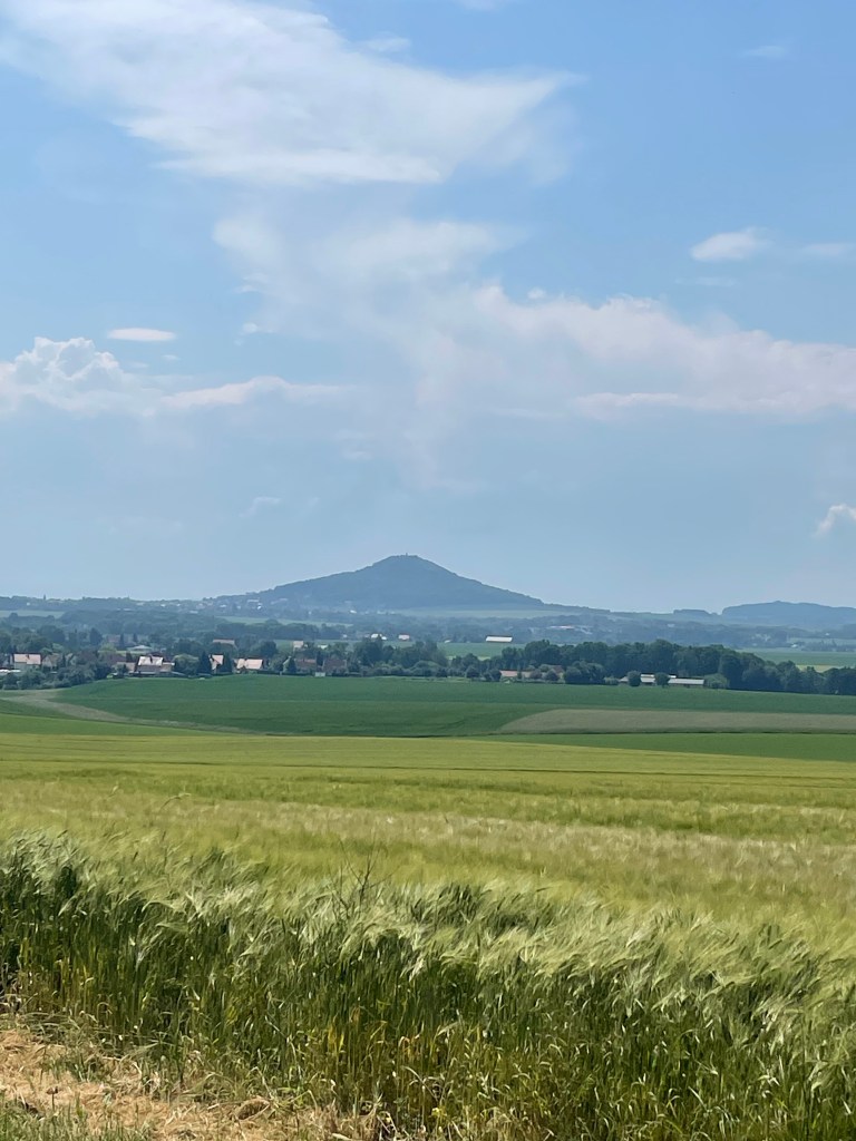 Die Landschaft ist herrlich, das Wetter toll. Allerdings etwas heiß, es liegt ein süßer schwerer Duft von Holunder in der Luft und die Grillen zirpen dazu.Wir laufen durch wunderschöne Wälder und über blühende Wiesen. Die Kirschen sind leider noch nicht ganz reif.