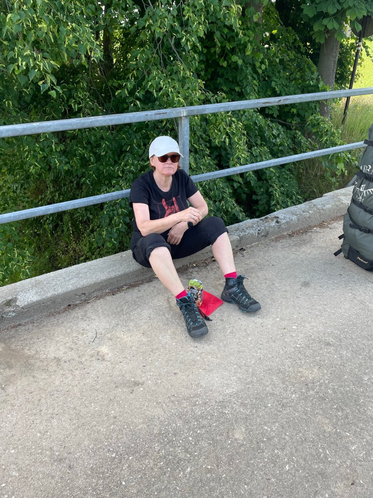 Wir laufen am Fluß weiter und die Sonne brutzelt ganz schön, als wir wieder durch eine kleine Ortschaft kommen, wo alle Läden noch zwei Stunden geschlossen haben, außer einer Fleischerei, wo wir uns was für das Abendessen kaufen. Getränke gibt es da allerdings nicht.